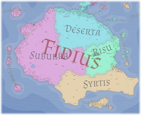 Der Kontinent Fidius wird großflächig von Wüsten durchzogen, was es den meisten Wesen schwierig macht dort zu leben. Vor allem Dämonen haben hier zu früheren Zeiten gelebt und auch in den modernen Zeiten kann man dort einige antreffen. Hingegen haben die Gewöhnlichen, Druiden und Magier es vorgezogen im Küstenbereich und nahe des Dschungels zu leben. Fidius wird in vier Länder aufgeteilt:  •	Deserta (Hauptstadt: Bastet) •	Suburra (Hauptdorf: Vaculla) •	Syrtis (Hauptstadt: Lemphis) •	Risu (Hauptstadt: Tafnes)  In den Wüsten können tagsüber bis zu 60 °C werden und nachts bis zu 30°C fallen. In den Wintermonaten kann es in der Wüste nachts sogar bis zu -10°C kalt werden. An den Küsten und im Dschungel ist es dagegen doch etwas kühler mit max. 45 °C am Tag. In den meisten Gebieten bleiben die Temperaturen konstant um die 27 - 30 °C.  Zu Fidius gehören einige Inseln und Inselgruppen. Diese sind ebenfalls nur spärlich bewohnt, bieten jedoch durch die Meereswinde eine sehr viel angenehmere Atmosphäre und Temperaturen von 25 bis max. 33 °C.  Trotz der hohen Temperaturen gibt es stetig wachsende Zahlen in den Dörfern und Städten, sowie Zuwanderer aus Portunus und Mercurius.  Das wohl am dichtesten besiedelte Land von Fidius ist Deserta, welches auf die Verbindung zwischen Portunus und Fidius, sowie den diversen Flüssen zurück zu führen ist. Die Hauptstadt Bastet, sowie die Städte Harena, Sandyx, Ebur und Excetra waren schon zu Zeiten der Pharaonen die Größten ihrer Zeit. Daran hat sich nichts geändert und die Bewohner leben dort von Feldbau, Handwerk und weltweitem Handel über die Hafenstädte und -dörfer.  Deserta wird von dem Ascania Dschungel, als auch vom Contumax Dschungel durchzogen. Während der Ascania Dschungel sich weitflächig im Norden ausgebreitet hat, ist der Contumax Dschungel nicht ganz so dicht und einfacher zu durchwandern. Der Contumax Dschungel zieht sich an fast der gesamten Ostküste entlang und ist der einzige Weg nach Risu, sofern man nicht die Wüste durchwandern möchte.   Desertas Wüste teilt sich in drei Bereiche auf, die etwas kühlere Wüstengegend nahe dem Ascania Dschungel, der Steppe zwischen den Städten Sandyx und Harena, sowie der heißen Sandwüste, welche auch den restlichen Kontinent durchzieht.  Das gesamte Land ist flach und hat fast keine Gebirgslandschaft. Nur wenn man Richtung Norden zieht, um den Kontinent Portunus zu erreichen, muss man über das Moniturus Gebirge. Der höchste Gipfel liegt in 5.199 km Höhe. Ein breiter Pass führt sicher durch das Gebirge hindurch, aber es gibt auch mutige Kletterer die versuchen die Gipfel zu erreichen. Die meisten, die es je versucht haben, hatten unschöne Begegnungen mit Dämonen, die in den höheren Ebenen oftmals in Höhlen hausen.  Zu Deserta gehören die Caralan Inseln, sowie die kleinste Insel der Magnovia Inseln. Die Caralan Inseln sind vom Contumax Dschungel geprägt, auf jeder der Inseln gibt es ein einziges Dorf, welches durch Fischfang, sowie den Schifffahrtshandel lebt. Die kleine Magnovia Insel gehört von dem Klima und der Pflanzenwelt eher zum Kontinent Portunus. Allerdings hatte man sich beim Streit um die Kontinentsgrenzen schwer einigen können. Als friedliche Lösung hatte man die Magnovia Insel aufgeteilt. Deserta erhielt die näher liegende kleine Insel, welche Gebirgsfrei und nur mit geringem Baumbestand bestückt ist. Dort herrschen im Sommer um die 23 - 30 °C. Im Winter kann es auch bis zu -5 °C kalt werden.   Die Hauptstadt Bastet liegt direkt am Meer und wird von einem der Flüsse Desertas durchzogen. Im Stadtzentrum, dem Stadtteil Azae liegt der Marktplatz, wo noch immer zwei Mal die Woche wie in früheren Zeiten frisches Obst und Gemüse, sowie andere Lebensmittel und Kleidung verkauft wird. Im Süden innerhalb der Stadtmauer liegt der Mubastis Tempel, wo noch heute die Statuen der drei höchsten ägyptischen Götter stehen. Innerhalb des Mauerringes vom Stadtzentrum liegen außerdem noch die Stadteile Leaethus und Bemphis. Leaethus verfügt über zwei moderne Häfen, über die der Handel, als auch der Tourismus läuft.  Äußerhalb des Mauerrings liegt im Osten der Stadtteil Noryllus. Dieser ist eher ruhig im Gegensatz zu dem aktiven Alltag im Stadtzentrum und wird vor allem von Bauern und einfachen Leuten bewohnt. Verlässt man über diesen die Stadt, kommt man in den meisten Fällen an den weitläufigen Feldern vorbei.  Im Westen sind die Stadtteile Surcrea und Ortentis zu finden. Sucrea verfügt ebenfalls über einen Hafen über den ausschließlich Handel geführt wird. Ortentis ist hingegen durch Armut und Kriminalität geprägt.   Auf der anderen Seite des Flusses liegt der Stadtteil Gezira. Lediglich einige Fähren verbinden diesen mit dem Rest der Stadt, die die Anwohner zusätzlich in oder aus der Stadt führen. Bewohner, die direkt am Fluss wohnen, verfügen meist über ein eigenes kleines Boot.   Zu Hochzeiten der ägyptischen Pharaonen wurde in Bastet sowie anderen großen Städten auch die Hexerei ausgeübt. Noch heute gibt es einige Hexer und Hexen, die dort im verborgenen Leben.  Das Land Suburra liegt im Westen von Fidius und wird nur von sehr wenigen Gewöhnlichen bewohnt. Mitten in der Wüste, jedoch nahe der Grenze zu Deserta liegen die alten Ruinen eines einstigen Dorfes der Gewöhnlichen unter dem Sand vergraben. Oftmals wurde versucht in der Suburra Wüste doch Fuß zu fassen, allerdings ohne Erfolg. Den einzigen Lebewesen, denen das gelungen war, waren die Dämonen. Zu ihren Hochzeiten gab es dort die Dämonenstadt Nemorosus, nahe der Livor Oase. Heute stehen dort nur noch die Ruinen, die langsam von der Wüste verschlungen werden. Weiter im Süden liegt im Rubidus Dschungel eine Quelle, welche zwischen einigen Felsen entspringt. Von Dämonen wurde sie einst als Schicksalsquelle bezeichnet, an der ein jedes Schicksal eines Dämons beginnt und auch endet. Viele tote Dämonenkörper wurden in der Nähe dessen im Feuer be