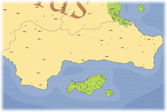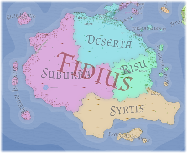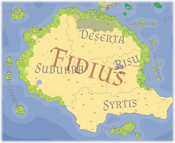 Der Kontinent Fidius wird großflächig von Wüsten durchzogen, was es den meisten Wesen schwierig macht dort zu leben. Vor allem Dämonen haben hier zu früheren Zeiten gelebt und auch in den modernen Zeiten kann man dort einige antreffen. Hingegen haben die Gewöhnlichen, Druiden und Magier es vorgezogen im Küstenbereich und nahe des Dschungels zu leben. Fidius wird in vier Länder aufgeteilt:  •	Deserta (Hauptstadt: Bastet) •	Suburra (Hauptdorf: Vaculla) •	Syrtis (Hauptstadt: Lemphis) •	Risu (Hauptstadt: Tafnes)  In den Wüsten können tagsüber bis zu 60 °C werden und nachts bis zu 30°C fallen. In den Wintermonaten kann es in der Wüste nachts sogar bis zu -10°C kalt werden. An den Küsten und im Dschungel ist es dagegen doch etwas kühler mit max. 45 °C am Tag. In den meisten Gebieten bleiben die Temperaturen konstant um die 27 - 30 °C.  Zu Fidius gehören einige Inseln und Inselgruppen. Diese sind ebenfalls nur spärlich bewohnt, bieten jedoch durch die Meereswinde eine sehr viel angenehmere Atmosphäre und Temperaturen von 25 bis max. 33 °C.  Trotz der hohen Temperaturen gibt es stetig wachsende Zahlen in den Dörfern und Städten, sowie Zuwanderer aus Portunus und Mercurius.  Das wohl am dichtesten besiedelte Land von Fidius ist Deserta, welches auf die Verbindung zwischen Portunus und Fidius, sowie den diversen Flüssen zurück zu führen ist. Die Hauptstadt Bastet, sowie die Städte Harena, Sandyx, Ebur und Excetra waren schon zu Zeiten der Pharaonen die Größten ihrer Zeit. Daran hat sich nichts geändert und die Bewohner leben dort von Feldbau, Handwerk und weltweitem Handel über die Hafenstädte und -dörfer.  Deserta wird von dem Ascania Dschungel, als auch vom Contumax Dschungel durchzogen. Während der Ascania Dschungel sich weitflächig im Norden ausgebreitet hat, ist der Contumax Dschungel nicht ganz so dicht und einfacher zu durchwandern. Der Contumax Dschungel zieht sich an fast der gesamten Ostküste entlang und ist der einzige Weg nach Risu, sofern man nicht die Wüste durchwandern möchte.   Desertas Wüste teilt sich in drei Bereiche auf, die etwas kühlere Wüstengegend nahe dem Ascania Dschungel, der Steppe zwischen den Städten Sandyx und Harena, sowie der heißen Sandwüste, welche auch den restlichen Kontinent durchzieht.  Das gesamte Land ist flach und hat fast keine Gebirgslandschaft. Nur wenn man Richtung Norden zieht, um den Kontinent Portunus zu erreichen, muss man über das Moniturus Gebirge. Der höchste Gipfel liegt in 5.199 km Höhe. Ein breiter Pass führt sicher durch das Gebirge hindurch, aber es gibt auch mutige Kletterer die versuchen die Gipfel zu erreichen. Die meisten, die es je versucht haben, hatten unschöne Begegnungen mit Dämonen, die in den höheren Ebenen oftmals in Höhlen hausen.  Zu Deserta gehören die Caralan Inseln, sowie die kleinste Insel der Magnovia Inseln. Die Caralan Inseln sind vom Contumax Dschungel geprägt, auf jeder der Inseln gibt es ein einziges Dorf, welches durch Fischfang, sowie den Schifffahrtshandel lebt. Die kleine Magnovia Insel gehört von dem Klima und der Pflanzenwelt eher zum Kontinent Portunus. Allerdings hatte man sich beim Streit um die Kontinentsgrenzen schwer einigen können. Als friedliche Lösung hatte man die Magnovia Insel aufgeteilt. Deserta erhielt die näher liegende kleine Insel, welche Gebirgsfrei und nur mit geringem Baumbestand bestückt ist. Dort herrschen im Sommer um die 23 - 30 °C. Im Winter kann es auch bis zu -5 °C kalt werden.   Die Hauptstadt Bastet liegt direkt am Meer und wird von einem der Flüsse Desertas durchzogen. Im Stadtzentrum, dem Stadtteil Azae liegt der Marktplatz, wo noch immer zwei Mal die Woche wie in früheren Zeiten frisches Obst und Gemüse, sowie andere Lebensmittel und Kleidung verkauft wird. Im Süden innerhalb der Stadtmauer liegt der Mubastis Tempel, wo noch heute die Statuen der drei höchsten ägyptischen Götter stehen. Innerhalb des Mauerringes vom Stadtzentrum liegen außerdem noch die Stadteile Leaethus und Bemphis. Leaethus verfügt über zwei moderne Häfen, über die der Handel, als auch der Tourismus läuft.  Äußerhalb des Mauerrings liegt im Osten der Stadtteil Noryllus. Dieser ist eher ruhig im Gegensatz zu dem aktiven Alltag im Stadtzentrum und wird vor allem von Bauern und einfachen Leuten bewohnt. Verlässt man über diesen die Stadt, kommt man in den meisten Fällen an den weitläufigen Feldern vorbei.  Im Westen sind die Stadtteile Surcrea und Ortentis zu finden. Sucrea verfügt ebenfalls über einen Hafen über den ausschließlich Handel geführt wird. Ortentis ist hingegen durch Armut und Kriminalität geprägt.   Auf der anderen Seite des Flusses liegt der Stadtteil Gezira. Lediglich einige Fähren verbinden diesen mit dem Rest der Stadt, die die Anwohner zusätzlich in oder aus der Stadt führen. Bewohner, die direkt am Fluss wohnen, verfügen meist über ein eigenes kleines Boot.   Zu Hochzeiten der ägyptischen Pharaonen wurde in Bastet sowie anderen großen Städten auch die Hexerei ausgeübt. Noch heute gibt es einige Hexer und Hexen, die dort im verborgenen Leben.  Das Land Suburra liegt im Westen von Fidius und wird nur von sehr wenigen Gewöhnlichen bewohnt. Mitten in der Wüste, jedoch nahe der Grenze zu Deserta liegen die alten Ruinen eines einstigen Dorfes der Gewöhnlichen unter dem Sand vergraben. Oftmals wurde versucht in der Suburra Wüste doch Fuß zu fassen, allerdings ohne Erfolg. Den einzigen Lebewesen, denen das gelungen war, waren die Dämonen. Zu ihren Hochzeiten gab es dort die Dämonenstadt Nemorosus, nahe der Livor Oase. Heute stehen dort nur noch die Ruinen, die langsam von der Wüste verschlungen werden. Weiter im Süden liegt im Rubidus Dschungel eine Quelle, welche zwischen einigen Felsen entspringt. Von Dämonen wurde sie einst als Schicksalsquelle bezeichnet, an der ein jedes Schicksal eines Dämons beginnt und auch endet. Viele tote Dämonenkörper wurden in der Nähe dessen im Feuer be